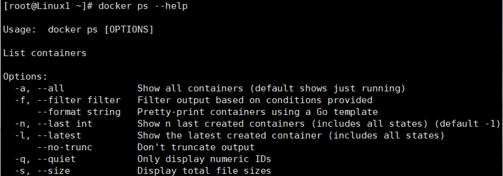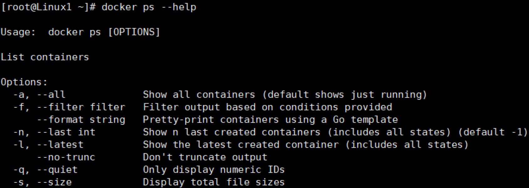 我们首先使用docker ps --help