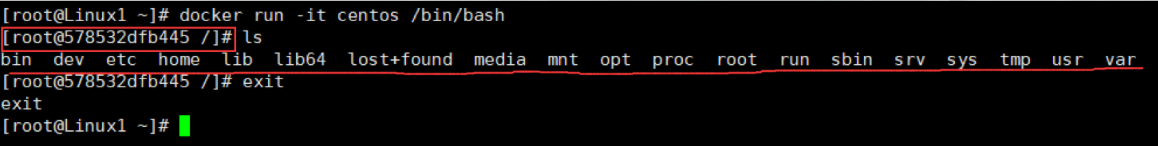 使用centos进行交互模式启动容器,在容器内执行/bin/bash