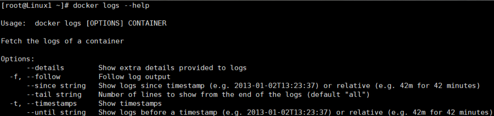 -t # 显示时间戳 -f # 打印最新的日志 --tail 数字 # 数字---显示多少条