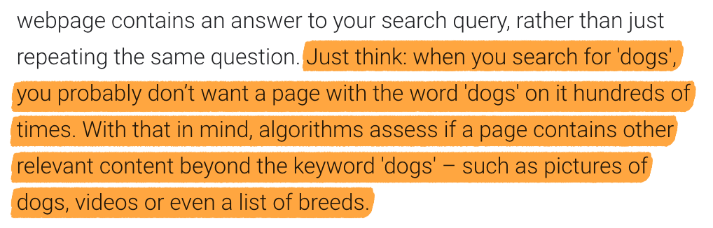 谷歌最终会寻找最相关的搜索结果,所以他们的算法也会寻找页面上的其他相关内容。如果你的页面是关于狗的,你没有提到不同的品种,谷歌知道可能还有更多相关的搜索结果。
