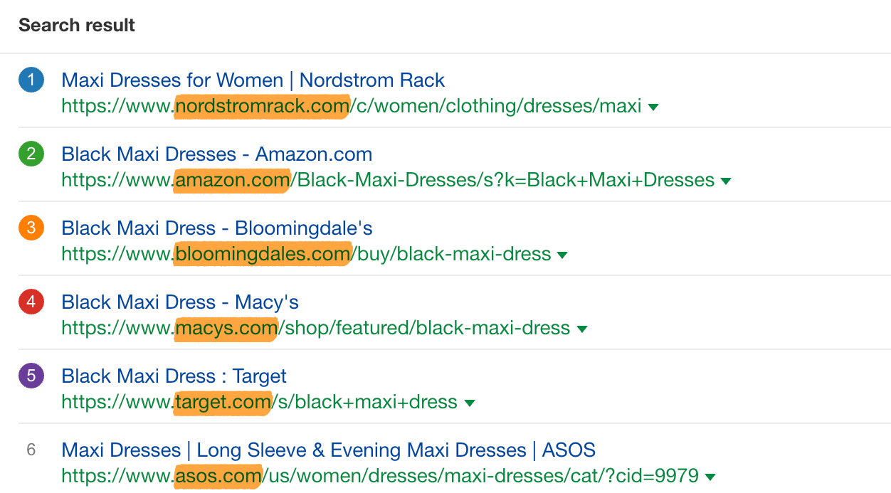 内容类型通常分为五种: 博客帖子、产品、分类、登陆页面或视频。例如,所有排名最高的“黑色长裙”页面都是来自知名商店的电子商务分类页面。