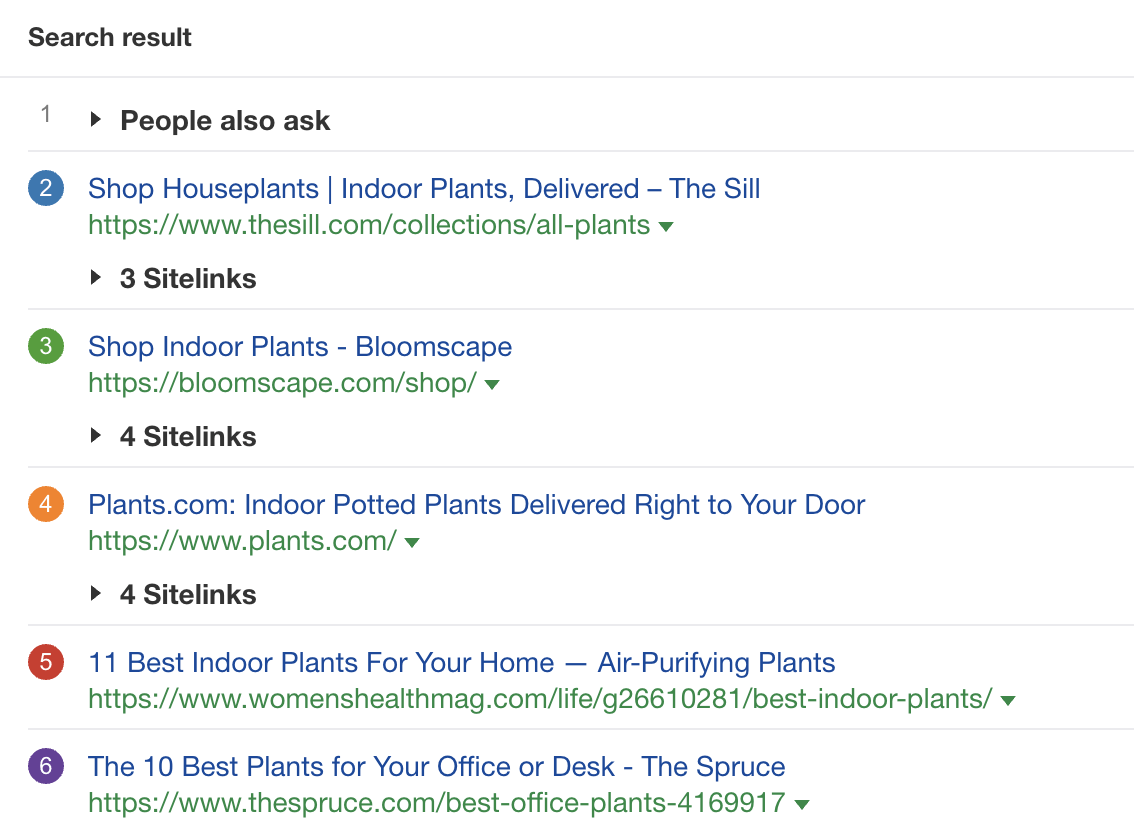 如果发生这种情况,请尽力判断。 在这种情况下,尽管结果中的博客文章和电子商务页面之间大约是一半对一半的比例,但前三名是电子商务页面。 这告诉我们,大多数搜索者是在购物,而不是在学习,因此您可能最有机会在电子商务页面上对该关键字进行排名。