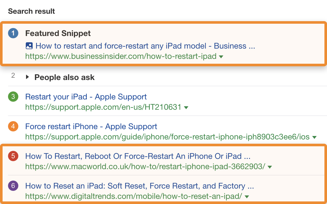 例如,“强制重启 iPad”的每个结果都是操作指南,除了苹果网站上的那些。