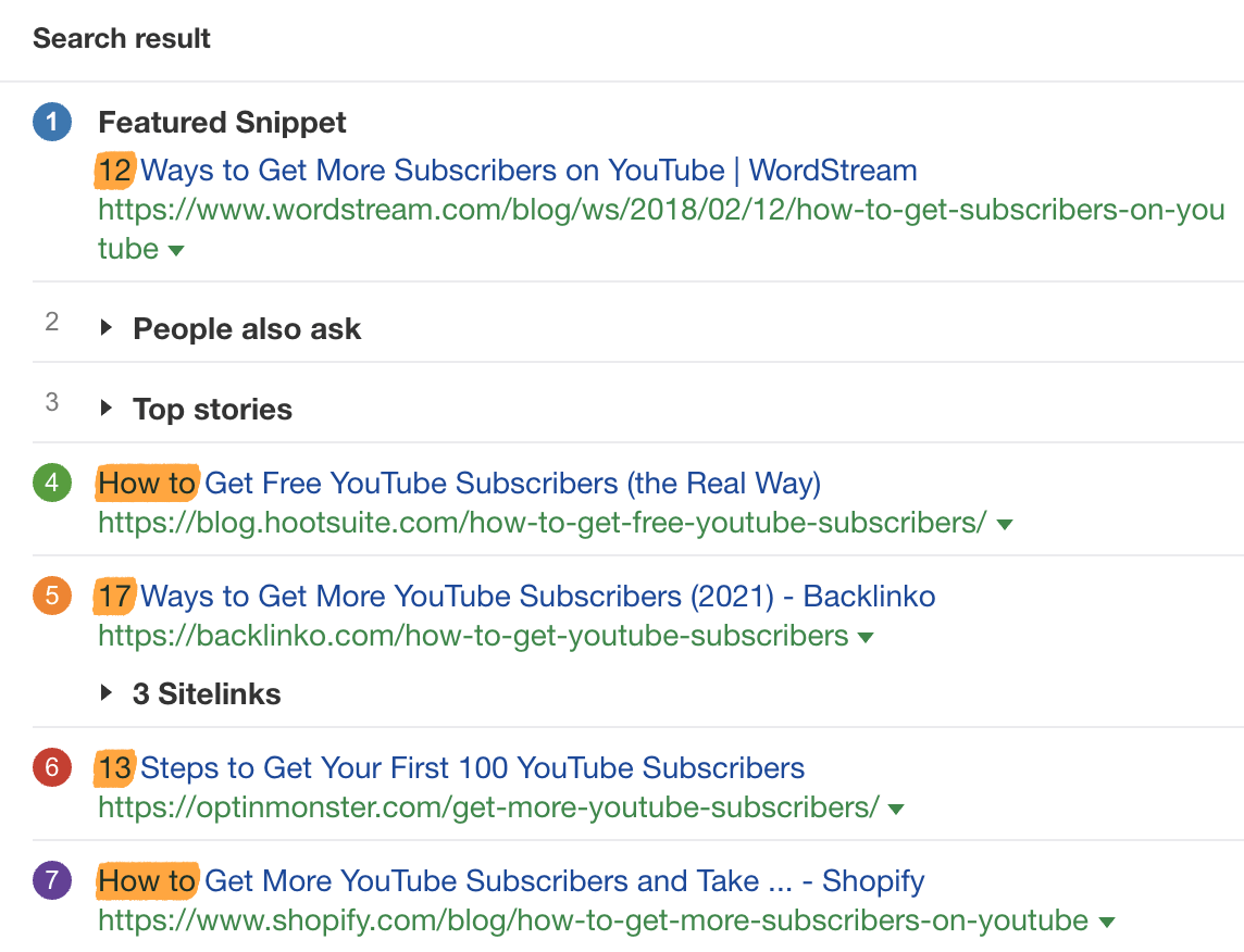 只要看一下排名靠前的“如何在 youtube 上获得更多订阅者”页面,就知道混合了非常多的 how-to 和 listicle 格式的博客文章。