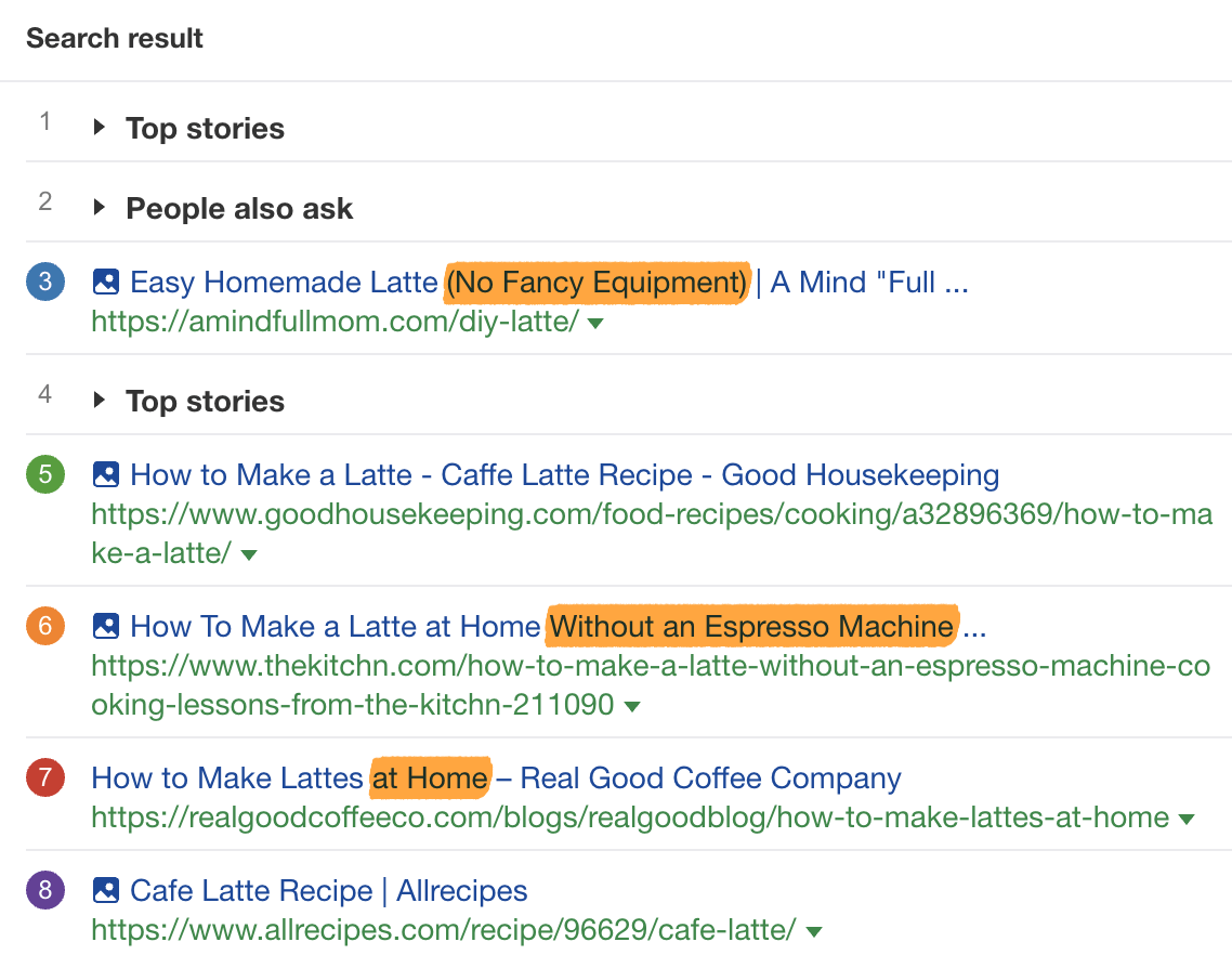 内容角度是指内容的主要‘卖点’。例如,那些搜索“如何制作拿铁”的人似乎想知道如何在没有专业设备的情况下在家制作拿铁。