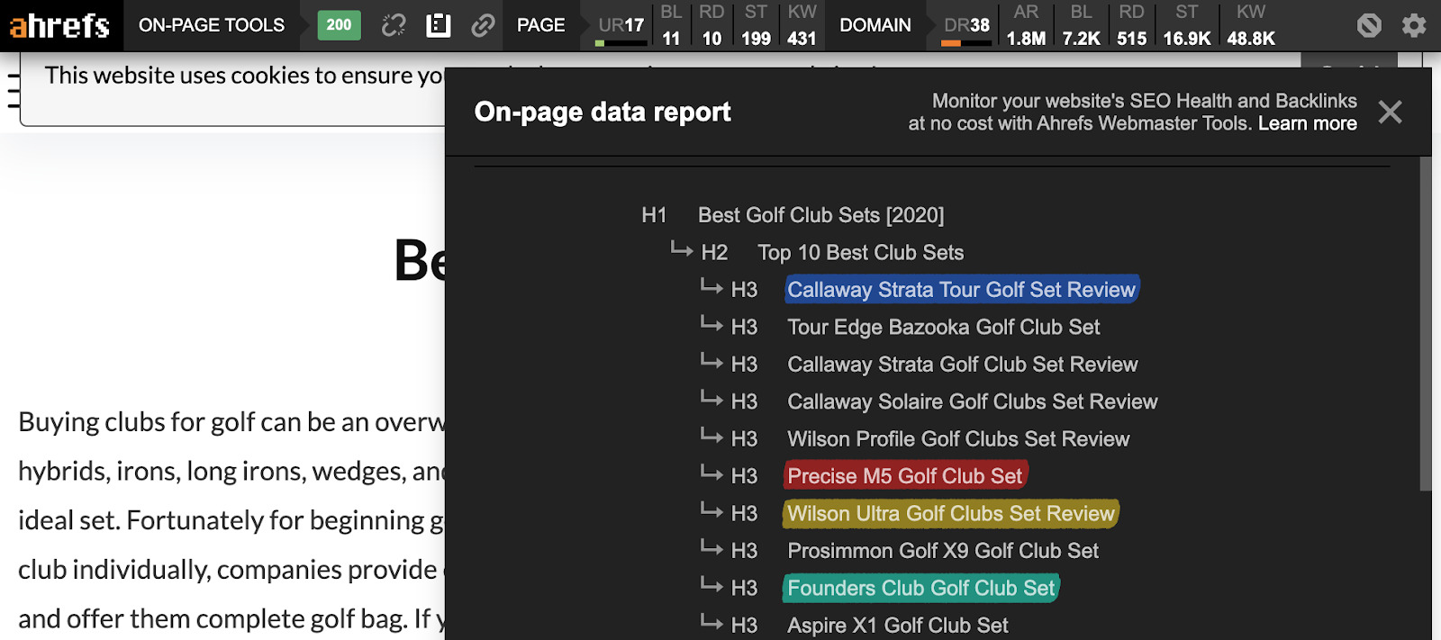 例如,如果我们使用 Ahrefs SEO工具栏中的免费页面报告,你将看到排名最高的“最好的高尔夫球杆套装”的页面提到了一些相同的套装。