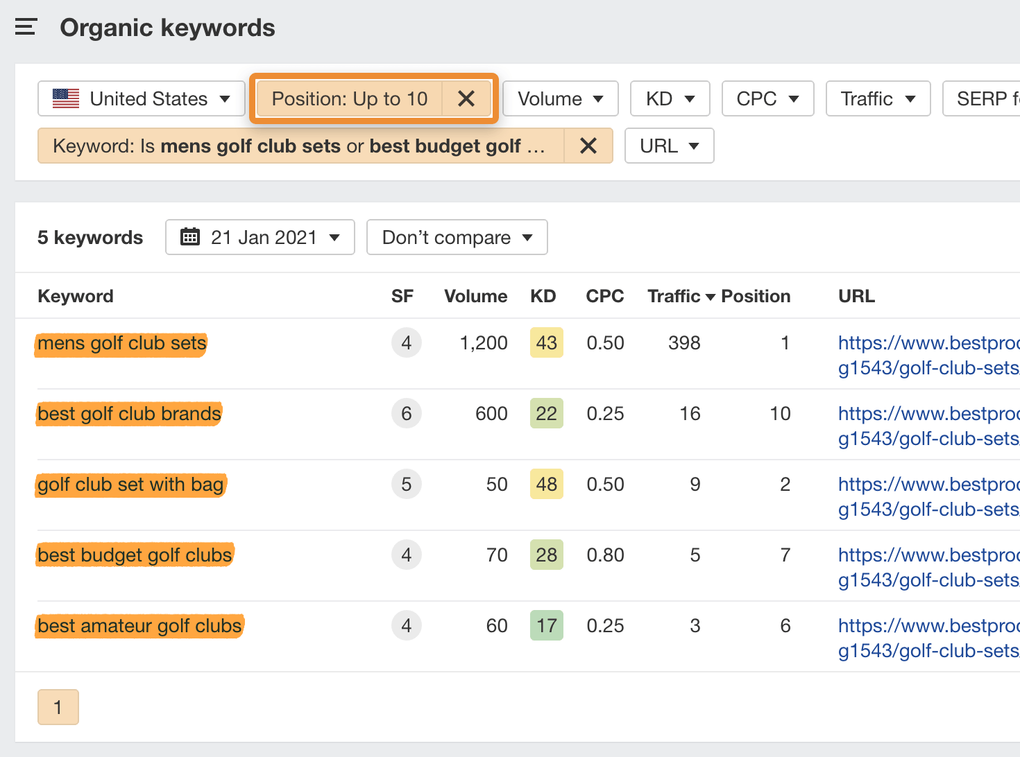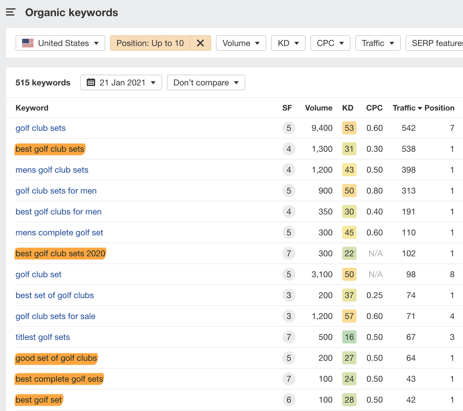 这些关键字中的许多将是搜索同一事物的其他方式。例如,如果我们把“最佳高尔夫俱乐部集”的排名最高的页面插入到 Ahrefs 的关键词分析中,然后检查自然关键词报告,我们会发现它也会对以下关键词进行排名: