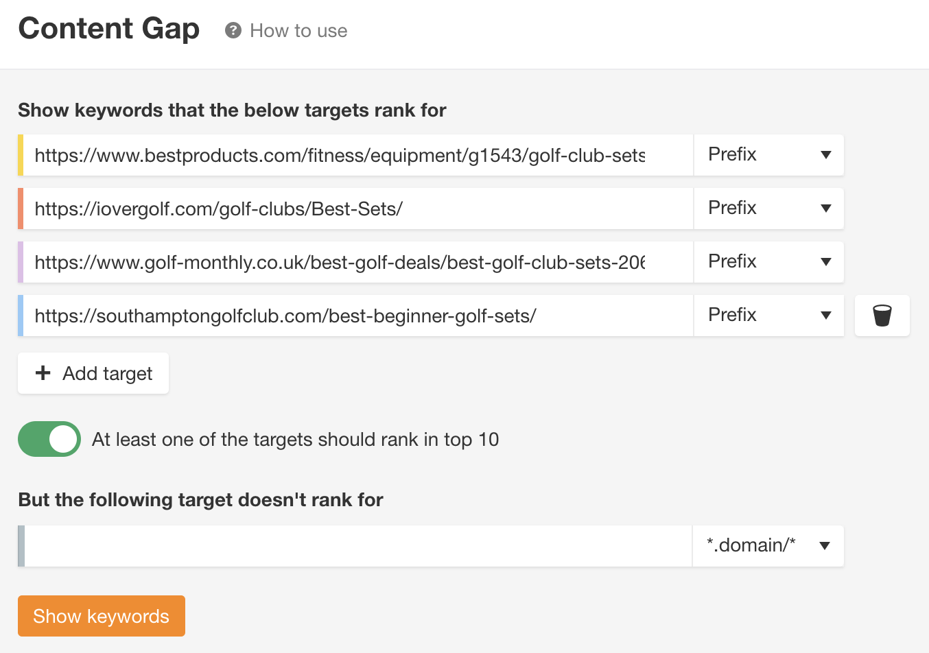 将相关的排名靠前的页面输入到Ahrefs的内容差距机会工具中…