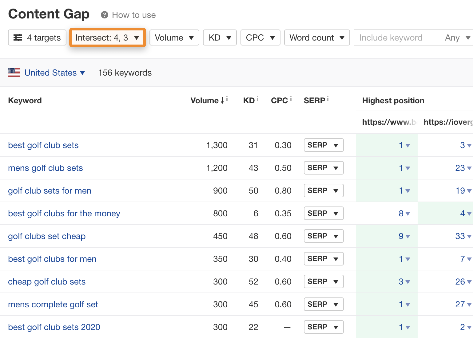 另一种方法是寻找多个页面之间的关键词交集。要做到这一点,把一些相关的网页链接插入到 Ahrefs 的内容差距机会工具中,然后调整交叉点的数量,直到你得到一组有意义的结果。