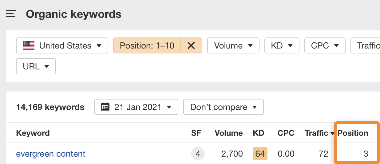 例如,假设我们想看看我们关于常青内容的帖子是否有精选摘要机会。如果我们把这个网址插入Ahrefs的网站分析,过滤有机关键词报告的前10名排名,我们就会看到我们已经在“常青内容”的前10名中排名了