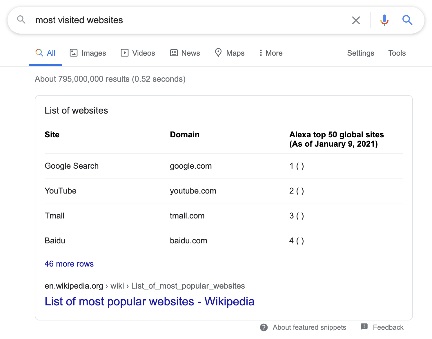 “访问量最高的网站”的精选摘要中的表格。