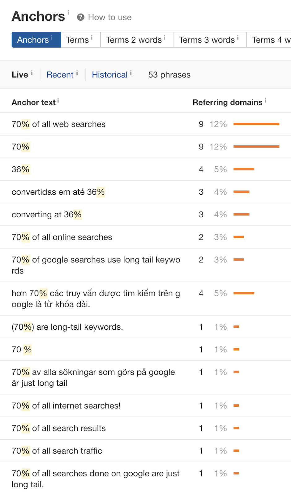 让我们将其中一篇文章插入网站分析并检查锚文本报告。这里显示了人们链接到页面时使用的最常见的单词和短语。在这种情况下,我们看到很多人因为统计数据而链接过来。