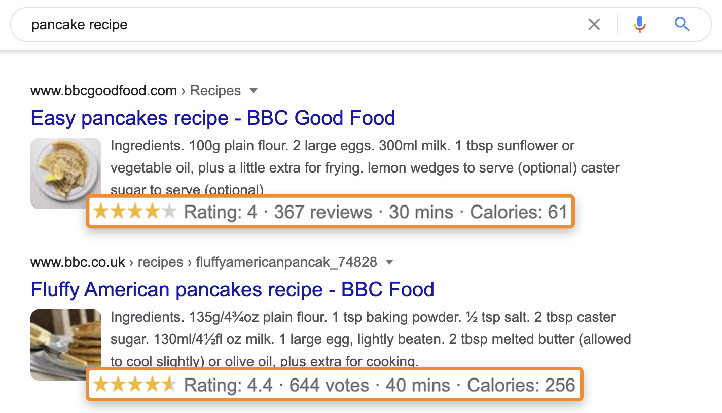 例如,谷歌为这些菜谱页面显示评分、烹饪时间和卡路里。