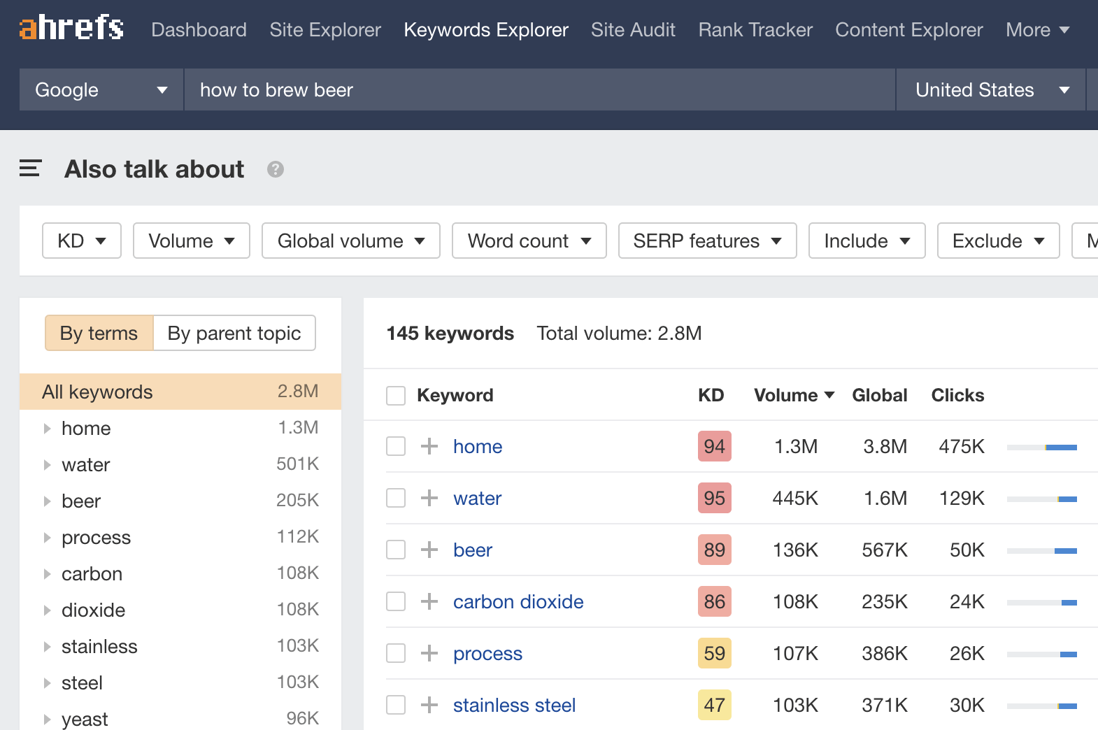 通过Ahrefs的关键词分析,“如何酿造啤酒 “的排名靠前的网页还谈论了什么。